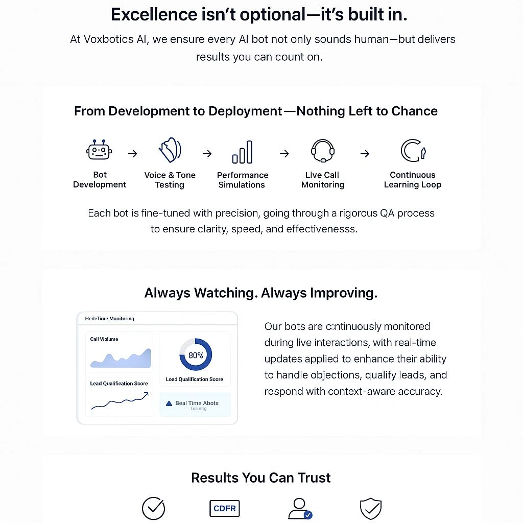 This visual shows how Voxbotics AI ensures every interaction is built for your success—from rigorous testing to real-time monitoring and continuous optimization. Because you deserve AI that’s not just smart—but always reliable, always improving, and always working for you.